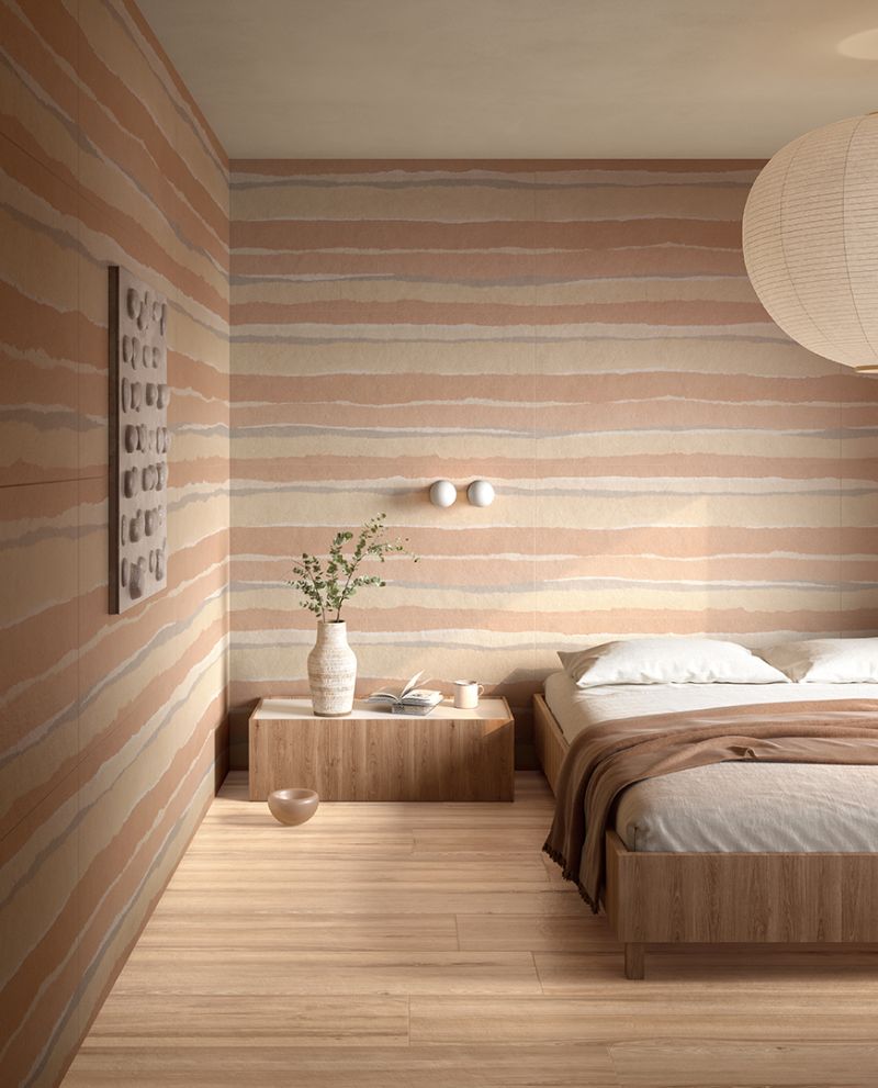 Naladí pocit klidu a rovnováhy, který se šíří celým interiérem. Lehká, struktura materiálu je inspirována technikou lisování hlíny tzv. technikou Pisé.
