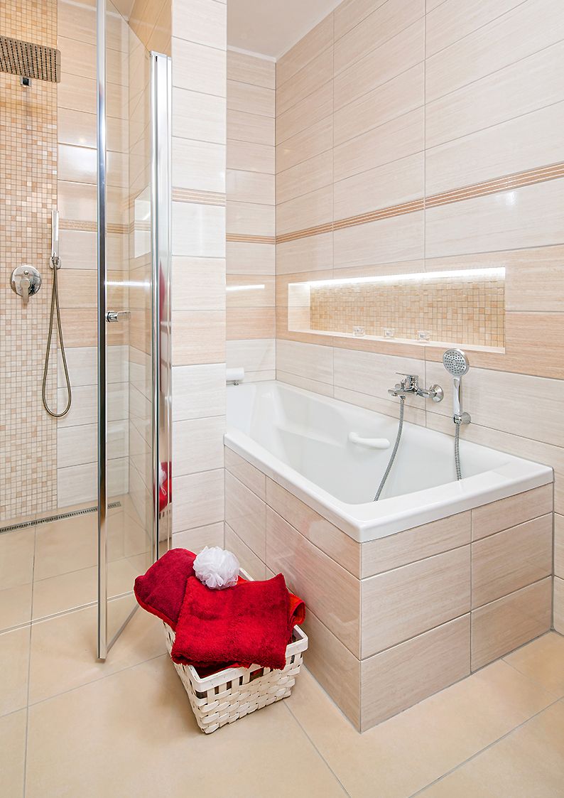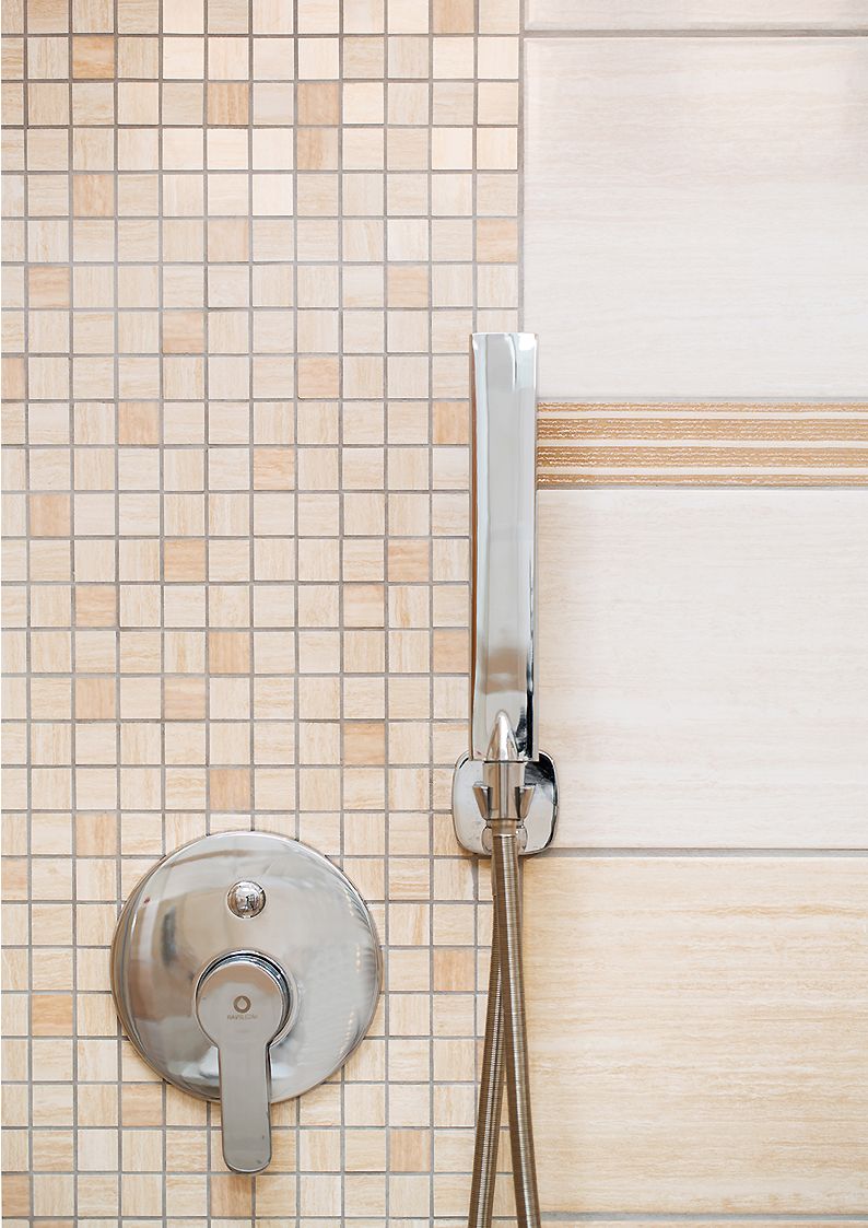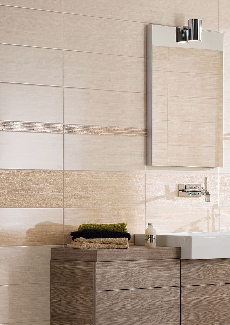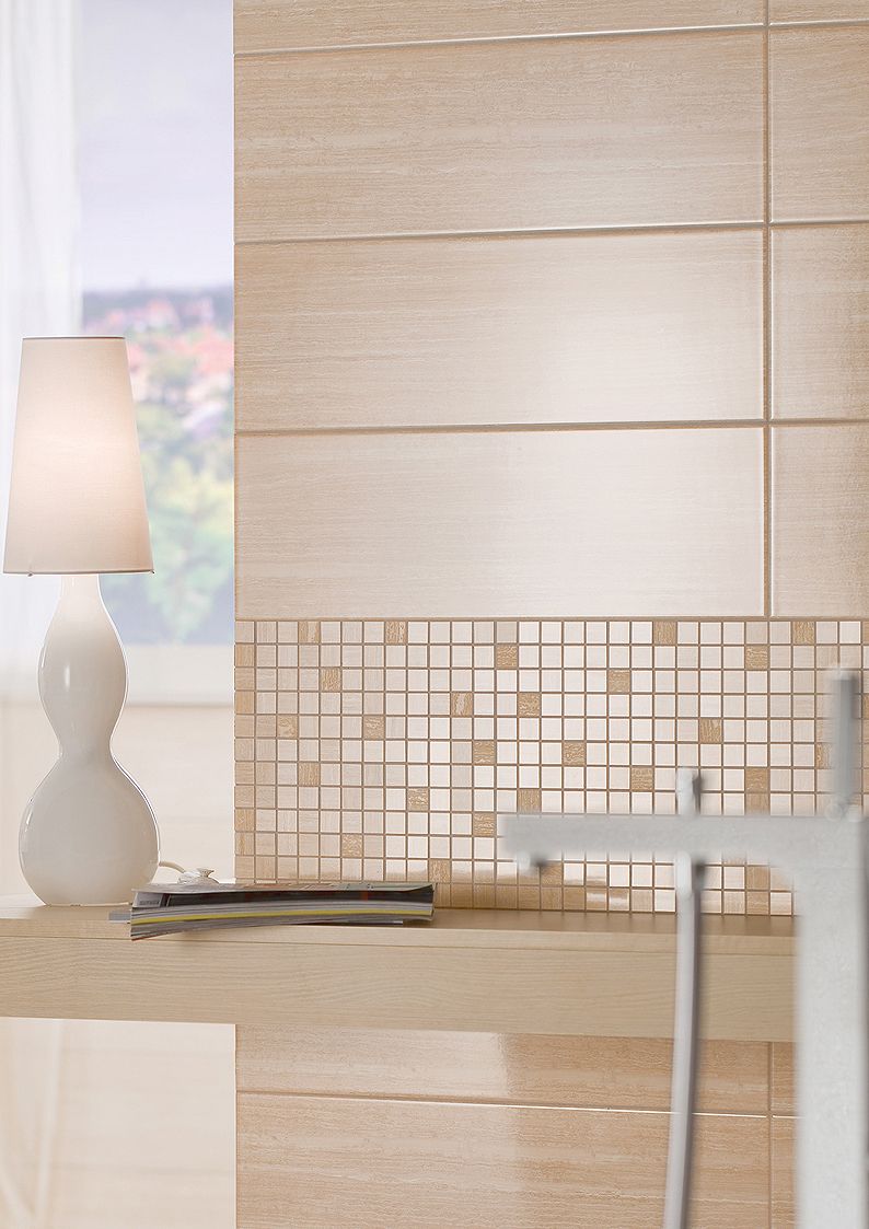 Série Senso je imitace travertinu. Obklady 20x60 od 667,-Kč/m2,dlažba může být z velkých formátů nebo lze i kombinovat s dlažbou s motivem dřeva.
